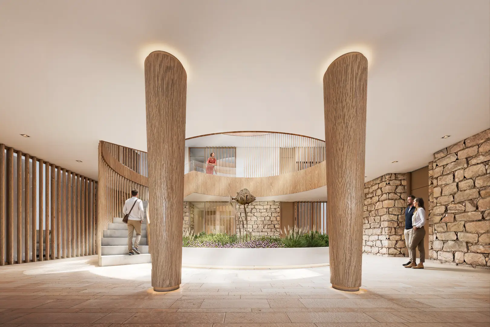 La zona común, ubicada en planta baja, se concibe como un espacio dedicado al bienestar e integra sala multiusos, gimnasio, coworking, vestuarios, sauna, cold plunge y cuarto de bicicletas, promoviendo un estilo de vida saludable y contemporáneo.